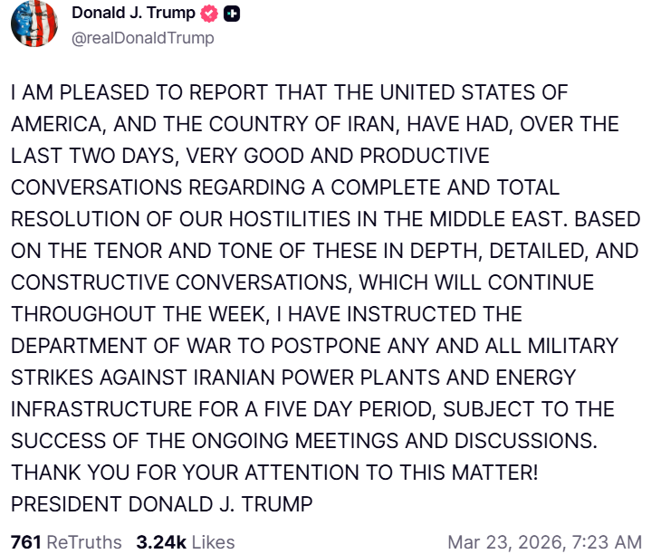 Les marchés commencent la semaine sur une forte réaction positive après les déclarations du week-end et surtout le message publié ce matin par Donald Trump évoquant des discussions « productives » avec l’Iran et un report temporaire des frappes. Cela nourrit l’espoir d’une désescalade partielle, même si les investisseurs demeurent prudents quant à la durabilité réelle de ces annonces. La réaction de marché est déjà très visible, notamment sur Wall Street et l’énergie. Mais il faudra demeurer prudent. Les investisseurs surveillent maintenant de très près les développements diplomatiques pour déterminer si cette détente est réelle et durable… ou simplement un répit temporaire dans un environnement géopolitique encore fragile.