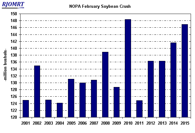 - Trituration de soya en février: 146.97 millions de boisseaux, 3.8% de plus qu’en février 2014 mais sous les estimés