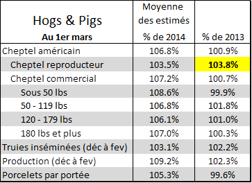- Demain, rapport trimestriel Hogs & Pigs: prévision moyenne à 1% plus de porc qu’en 2013