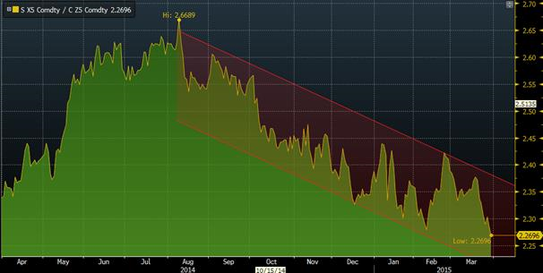 Graphique 1 : Prix du soya nov’15 divisé par le prix du maïs déc’15