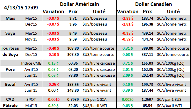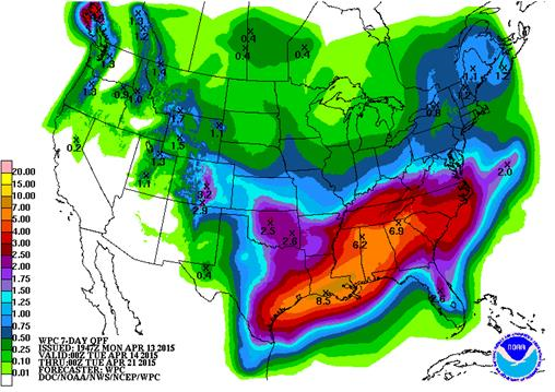 Maintenant à la mi-avril… la météo fait son entrée sur le tapis rouge comme joueur étoile pour les prochains mois, il deviendra un facteur déterminant pour les prix des grains. Pendant que les blés d’hiver émergent du sol, les précipitations du weekend dernier et des prochains jours (graphique 1) ont causé du tort à Chicago. De plus, on parle de plus en plus que la Russie pourrait enlever la restriction sur ses exportations de blé, augmentant l’offre mondial si cela arrive. Ouvrant à la baisse d’une dizaine de cents, le prix du blé d’hiver a fini la journée avec une baisse de plus que 4%, reposant actuellement sur son support technique. Il faut dire qu’actuellement, les prix des grains repose sur une lame de rasoir : le prix du blé, du maïs et du soya pour la prochaine récolte sont tous sur leur support technique, alors que le prix du tourteau a brisé son support vendredi dernier. Bien qu’il soit encore très tôt dans la récolte, on pourrait voir une journée sanglante dans le complexe céréalier si les prix baissent encore un peu… à suivre !