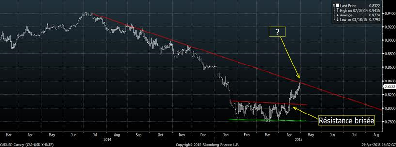 Ce matin, les États-Unis publiait leur croissance économique pour le 1er trimestre de 2015 qui était bien en dessous des estimés avec 0.2% de croissance. Cette faible progression économique est principalement expliquée par la température glaciale de l’hiver dernier. Suite à la nouvelle, le dollar canadien a touché un nouveau sommet en 3 mois à 0.837 $US par $CA, mais n’a pu percer la résistance en place depuis juillet 2014 (graphique 1). Il reste à voir ce qu’a été la croissance du Canada qui sera publiée demain matin. Face à cette situation, il est sage d’encaisser les profits sur les protections prises lorsqu’on était entre 0.78 et 0.80 pour se repositionner au niveau actuel.