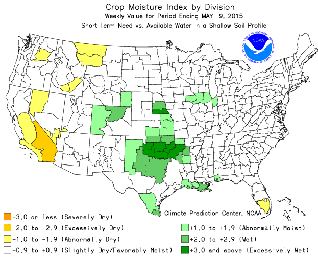 Avec les conditions météo de la semaine dernière, évidemment on s’attendait à une bonne progression des ensemencements aux États-Unis. En effet, la cadence continue avec une progression de 20% à 75% complété, soit une semaine en avance sur la moyenne des 5 dernières années. On demeure tout de même en dessous de la progression de 2010 lorsque les agriculteurs américains avaient terminé 81% des surface à cette période de l’année, alors que nous sommes en ligne avec le rythme de 2012. De plus, déjà 29% des cultures de maïs sont en émergence, en avance de 11% sur la moyenne. Dans le soya, on est à 31% des terres d’ensemencées ce qui est aussi une semaine d’avance par rapport la moyenne quinquennale. Même si les cultures de maïs et soya sont en avance, ce n’est pas comparable au blé de printemps dont les ensemencements sont presque terminés (87% complété) comparativement à une moyenne de 51% à la 2ème semaine de mai. Par ailleurs, la condition des pâturages s’améliore aux États-Unis en raison des précipitations des dernières semaines avec maintenant 56% des superficies en bonne état contrairement à 41% l’an dernier. Il faut dire qu’on a rarement vue autant de surplus d’eau dans la région du Texas et du Kansas (graphique 3).