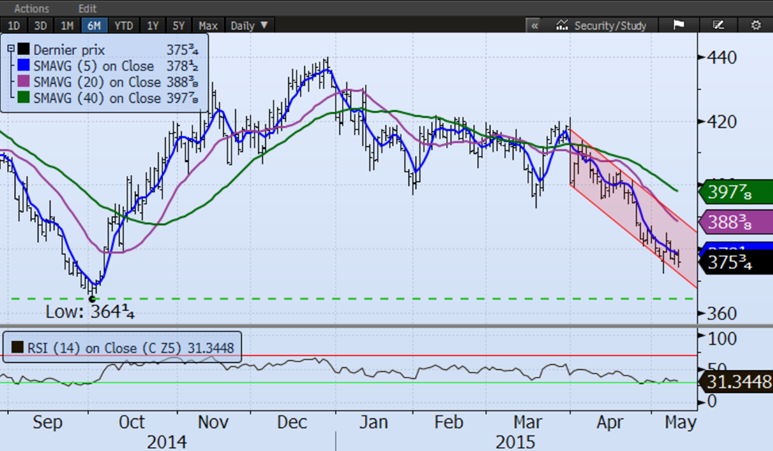 Analyse technique Maïs de déc'15 (¢US/boisseau) = Négatif