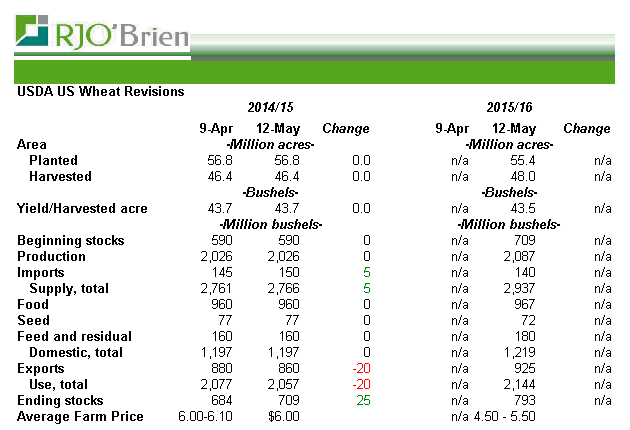 Pas de surprise sur l’ancienne récolte dans le sens ou les annulations d’exportation se reflètent dans le bilan. Le stock de fin est évalué à 709 millions de boisseaux et c’est légèrement plus que prévu. Ce qui nous intéresse particulièrement c’est la projection de la production des différents type de blé et les chiffres sont en ligne avec les prédictions des experts. La production 2015/16 de tous les types de blé est de 2.087 milliard de boisseaux, c’est légèrement sous les attentes de 2.096