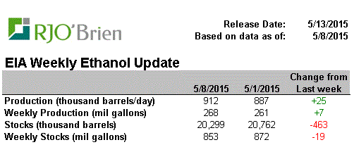 Production et stock d’éthanol en date du 8 mai 2015. Source de l’EIA comptabilisé par RJO