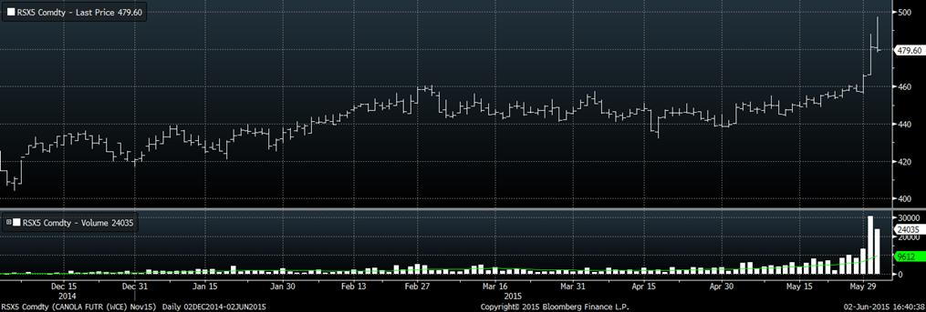 Hier, l’USDA publiait l’avancement des récoltes ainsi que les conditions des cultures. Le marché s’attendait à une amélioration de la condition du maïs alors qu’elle est restée inchangée à 74% classée « bien à excellent » contre 76% l’an dernier. De la sorte, le prix du maïs a presque gagné 2% au cours de la séance d’aujourd’hui, également influencé par la monté du prix du blé. Durant le dernier mois, on a vu de fortes et rapides augmentations dans le prix du blé, démontrant l’impact de la grosse position vendeur que détiennent les spéculateurs sur la volatilité des prix. Cette fois, c’est la température froide du weekend dernier au Canada qui a fait peur au marché. Samedi dernier, la température était sous zéro au Manitoba ce qui aurait endommagé les cultures de blé et de canola. Notamment, le conseil canadien du canola ont dit que d’importants dommages sont survenus, mais que l’acréage touché n’a pas encore été évalué. Malheureusement, les régions les plus touchées nécessiteront de nouveaux ensemencements. Les services agricoles du Manitoba ont précisé qu’il y a plus de 700 déclarations qui leurs ont été envoyées hier, principalement pour la culture de canola. Évidemment, ce facteur météo a causé de la turbulence pour le prix, passant de 457 $CA/tonne vendredi à 497 $CA/tonne pour les hauts d’aujourd’hui (graphique 1). Cette hausse a aussi eu des répercussions sur le reste du marché oléagineux, comme le soya.