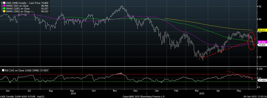 Ces 2 derniers jours ont été pénibles pour le prix du porc, en baisse de 3¢/lb. D’un point de vue fondamental, ce n’est pas si négatif : le prix cash est en ascension, le prix du porc découpé reste élevé (86.5 ¢/lb) et les abattoirs font de l’argent (6$/tête). De plus, un écart de 3¢/lb entre le prix cash de demain (82.47) et le prix actuel pour les livraisons d’août… cela démontre que la chute des prix d’été est un peu prononcée puisque c’est une première depuis 2001 ! Avec la fête des pères et la fête de l’indépendance américaine qui arriveront ces prochaines semaines, le prix cash pourrait continuer à monter face à la demande plus forte. Cela m’amène à croire que le fondamentale reste positif pour les prix d’été, que la récente baisse est principalement causée par des facteurs techniques, mais qu’il faut garder en tête que la production continue d’être élevée. Du point de technique, nous avons cassé plusieurs supports ce matin: le support ascendant, la moyenne mobile 50 jours et la moyenne mobile 100 jours, tous en même temps ce qui a évidemment envoyé des signaux de vente.