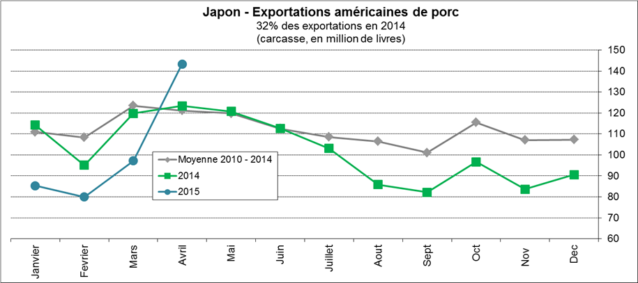· En avril, les exportations nettes de porc étaient très fortes, à 396M livres, 11% de plus qu’en 2014