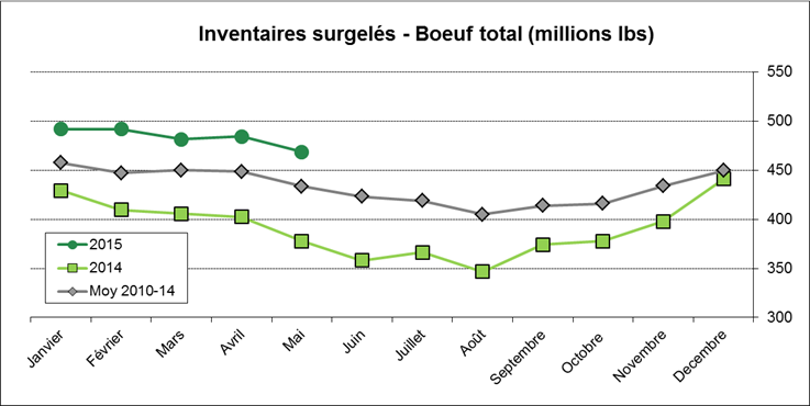 · Inventaires surgelés de bœuf : 24.1 % de plus qu’en mai 2014, à 468.6 M livres