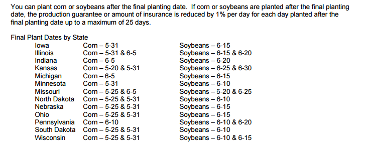 La météo continue d’être au premier plan et plus le temps avance, plus le marché est inquiet des semis de soja qui sont en retard au même moment que la qualité des cultures dégringolent. Mon collègue Gabriel en parlait hier et c’est toujours pertinent aujourd’hui. Si je me fie aux intentions d’ensemencement du mois de mars, les américains sont supposés semer 84.6 million d’acres de soja. La statistique est sortie plus faible que prévu je m’en rappel puisque les analystes estimaient les surfaces plus aux alentours de 86 millions. Bref, nous devons tout de même utiliser ce chiffre comme point de référence dans l’analyse. Si on comptabilise les champs qui sont semés via le Crop Progress (disponible chaque lundi http://usda.mannlib.cornell.edu/MannUsda/viewDocumentInfo.do?documentID=1048) on arrive à 8.621 millions d’acres qui sont encore à semer! Voir carte plus bas. Tous s’entendent pour dire que les producteurs feront tout en leur possible pour aller semer les champs qui reste. Habituellement les producteurs américains souscrivent à des polices d’assurance en cas d’incapacité à semer une parcelle de champ. J’ai pu trouver un exemple de PHI Insurance Services (ils utilisent le logo de Pioneer, sans doute une de leur filiale). Sans rentrer dans les détails du cas par cas, ils ont la possibilité d’assurer un pourcentage de leur rendement moyen pour couvrir ce qui semble être le cout d’opportunité. Normalement les dates maximales pour semer du soja tournent autour du 15-20 juin. Il est possible d’assurer la récolte même après ces dates, mais la couverture baisse de 1% à chaque jour (max 25 jours) et donc stabilise de moins en moins le revenu du producteur.