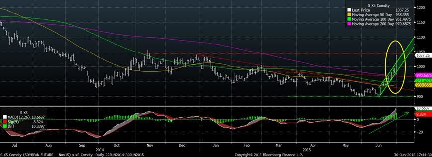 Forcément, toutes ces nouvelles, combinées avec la détérioration de la condition des cultures publiée hier soir, ont incité les acheteurs à se manifester sur les marchés lesquels étaient plutôt passifs ce printemps. De plus, les spéculateurs détenaient une position vendeur dans le complexe céréalier, causant un effet boule-de-neige sur les achats de grains. Reuters rapporte que les fonds de spéculation ont acheté, aujourd’hui seulement, 40K contrats de soya, 25K de maïs, 17K de blé et 12K de tourteau. Présentement, le momentum et la tendance sont haussier sur le prix du maïs (graphique 4) et du soya (graphique 5). Nous avons traversé plusieurs résistances assez facilement et si les craintes persistent au niveau des cultures américaines, cette nouvelle tendance pourrait bien continuer.