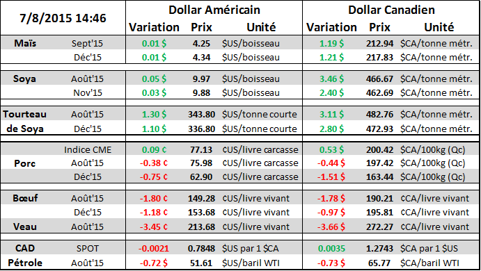 Coté lean hog plus tôt ce matin nous avons reçu les chiffres d’exportation mensuelles pour le mois de mai. Les exportations nettes ont atteint 356 million de livres, c’est 30M de moins qu’en avril mais tout de même 8.5M de plus qu’en mai 2014. Évidemment la majeure partie de la baisse vient des exportation japonaises et mexicaines (-33M livres).