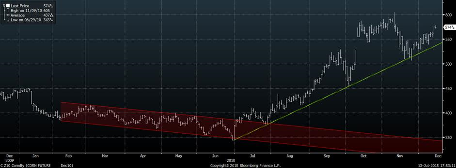 La dernière année dont nous avions eu beaucoup d’eau en juin était en 2010 et étrangement, cette récolte ressemble énormément à 2015! Premièrement, l’année 2009 avait connu une bonne baisse de prix de 4.50$ à 3.10$, un peu comme 2014. Deuxièmement, les ensemencements se sont très bien déroulés, même plus vite que cette année. Troisièmement, énormément d’eau durant le mois de juin ce qui a causé un manque d’azote dans les sols (est-ce le cas cette année… probablement). Quatrièmement, la condition des cultures étaient relativement bonne (graphique 2) au début de l’année. Au final, le rendement attendu pendant l’été était relativement bon, mais a passé de 165 boisseaux à l’acre en août à 152 boisseaux dans le rapport final. Le prix en 2010 avait touché un bas la veille du rapport du 30 juin pour ensuite prendre une tendance haussier pendant plusieurs mois et pour augmenter de plus de 2.50$/boisseau (graphique 6). Est-ce que ce sera le cas cette année ?