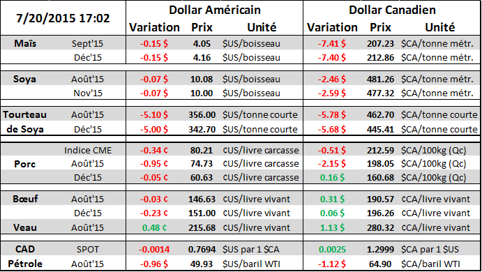 À très court terme, le prix du maïs semble beaucoup plus faible que le soya, s’ayant transigé sur son support à 4.21 $/boisseau pendant une bonne partie de la journée avant de subir une 2ème vague de vente, terminant la séance à 4.16$ (graphique 1). En plus d’avoir ouvert avec un « gap » à la baisse, nous avons brisé le support et le momentum est désormais vers la baisse. On peut penser que le violent mouvement d’aujourd’hui est en partie causé par un retrait des fonds spéculateurs dans le marché des grains, lesquels avaient accumulé une position de +202 700 contrats en date du 14 juillet, soit 30 000 de plus que la semaine précédente (tableau 2). La baisse pourrait continuer ces prochains jours puisque d’une part, les producteurs tenteront de sécuriser des prix au-dessus du coût de production avant qu’il ne soit trop tard, parce que les acheteurs pourraient rester patient face aux prévisions météo favorables pour le pollinisation en plus des fonds de spéculation qui pourraient se retirer du marché. La semaine dernière, les spéculateurs ont été moins actifs dans les autres marchés à l’exception du bœuf où ils ont liquidé 22 000 contrats.