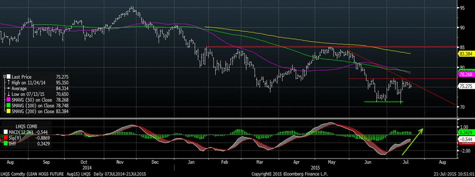 Depuis la chandelle de renversement du 13 juillet, ayant fait un nouveau bas, le prix du porc a beaucoup de difficulté à percer les nombreuses résistances. Pour le prix de décembre, on parle d’un triangle descendant ce qui pourrait s’avérer négatif si on ne réussi pas à percer la résistance d’ici la fin du mois. À l’exception du contrat août, le momentum semble neutre, on est en attente du prochain mouvement majeur afin de définir la direction d’une tendance future.