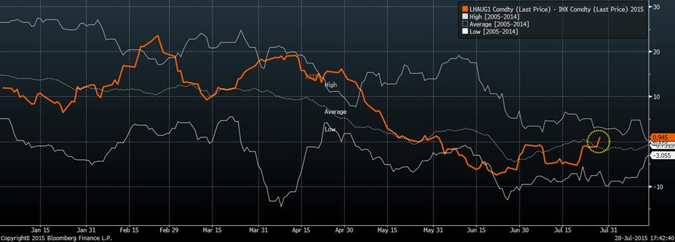 Le prix du porc a bien augmenté aujourd’hui, avec le contrat du mois d’août qui fait un sommet d’un mois et demi, alors que les autres livraisons font du statuquo depuis quelques semaines. Malgré un prix cash en baisse de 0.20¢/lb par jour depuis près de 2 semaines, les projections pour les livraisons à la mi-août sont très optimistes. Premièrement, le prix du porc découpé fait un nouveau sommet à 86.21¢US/lb (graphique 1) démontrant que la demande est bonne même si la production reste élevée. Cela fait le bonheur des abattoirs qui voient leur marge exploser à plus de 15$US/tête (graphique 2) ce qui pourrait les inciter à enchérir les prix des carcasses afin d’assurer un approvisionnement maximal. Par contre, le prix cash d’hier était seulement à 78.30 ¢/lb et l’indice du CME sortira demain à 78.36 ¢/lb (-0.16). D’ici 13 jours ouvrables, le prix du contrat d’août ira rejoindre celui de l’indice, mais ils semblent plutôt s’écarter à court terme. Alors que l’écart entre le prix du contrat d’août et celui de l’indice étaient à leur moyenne de la dernière décennie, le rebond d’aujourd’hui cause un écart de plus d’une cent la livre (graphique 3). Depuis 10 ans, c’est seulement arrivé à 2 reprises que le prix du contrat soit si élevé comparativement à l’indice du prix cash, soit en 2010 et 2011. La différence avec aujourd’hui est que le prix cash du porc était en ascension et pas en diminution. En résumé, le prix du contrat d’août a peu de potentiel haussier supplémentaire, commercialiser ses ventes du mois prochains à 210$CA/100kg semble un très bon début.