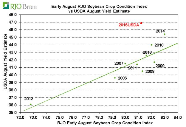 Bien franchement, comment l'USDA est arrivé à leur 46,9 boisseaux / acre de rendement est un mystère complet car il est si loin de la ligne de tendance habituelle d’un mois d’aout que nous ne savons pas comment aborder les chiffres. À l’aube du rapport, les conditions de début août des cultures de soja étaient inférieures à ceux de 2009, de 2010, de 2013 et de 2014! Cela n’a pas empêché l’USDA de prétendre que le rendement sera de 46,9 boisseaux / acre et c’est bien à l’extérieur du range attendu pour les années de forte productions ou les rendements d’aout étaient de l’ordre de 41.7 à 45.4. Le 1er graphique ci-dessous montre clairement à quel point la ligne de rendement diverge en terme historique et comment il était impossible de le voir venir. Même mis sous un autre angle, la qualité des cultures au début de mois étaient la 3e plus faible en sept ans, mais l’USDA publie le rendement le plus élevé jamais publié pour un mois d’aout et tous se creuse encore la tête à savoir comment est-ce possible…