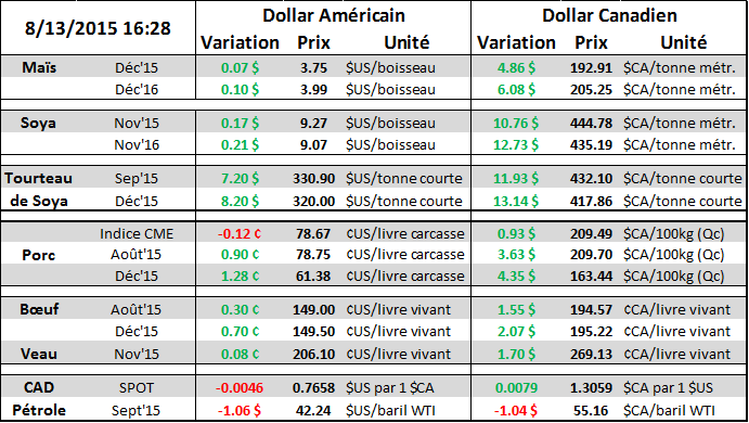 Le soja a volé la vedette alors que l'USDA a publié une estimation de rendement moyen inexplicablement élevé, résultant en une augmentation de leurs stocks de soya 2015/16 tandis que le marché anticipait une baisse de près de 30% dans les inventaires de fin de saison. En fait la projection de production de soja américain est extrêmement surprenante ; jamais dans les 30 dernières années il y a eu une aussi grande déviation entre les estimés et la donnée de l’USDA. La baisse violente des prix hier est donc une réaction compréhensible! La difficulté dans les prochaines semaines sera le degré de confiance, ou plutôt le manque de confiance des participants au marché face au réel rendement des champs américains compte tenu de l’information publié hier par l’USDA. En étant tôt dans la saison pour estimer la production, le rapport d’aout est parfois ignoré par les traders. Cependant, cela sera peut-être difficile à faire cette année étant donné que les projections fixées par l'USDA sont maintenant beaucoup plus grande que les attentes antérieures.