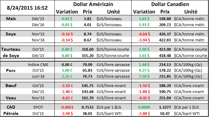 Comment cela se traduit-il pour le grain? L’impact est plus important pour le soja où près du deux tiers de la production américaine est exportée contrairement à 13% dans le maïs (Rapport USDA Aug-2015). De plus, une très forte proportion des exportations américaines se dirigent vers la Chine. Actuellement la Chine dévalue sa monnaie face au USD, son stock market plonge et les indicateurs économiques montrent un fort ralentissement au même moment ou les stocks mondiaux de fève (USA, Brésil, Argentine) sont prévus pour être record. Ça ne prend pas la tête à Papineau pour comprendre la chute de prix que nous subissions aujourd’hui sur CBOT et la possibilité de voir le mouvement continuer si la situation empire. Il faut comprendre que la planète va continuer de tourner et que les chinois vont continuer à manger, par contre ils n’auront pas le même budget pour le faire et ils ont la flexibilité pour l’acheter ailleurs comme en Amérique du Sud. A très court terme c’est alors peut-être plus un question de trouver le prix qui fera l’équilibre en l’offre et la demande plutôt que la quantité totale qui sera consommée en Chine puisque le style de vie et les habitudes alimentaires prennent un peu plus de temps à changer.