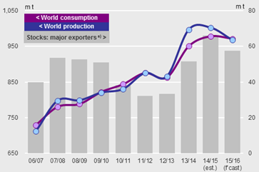 Estimation d’une production annuelle de 968Mt pour le maïs soit une année 2015/16 très légèrement supérieur à la consommation après les forts excès des deux dernières années. En comparaison l’USDA est à 985.6 Mt.