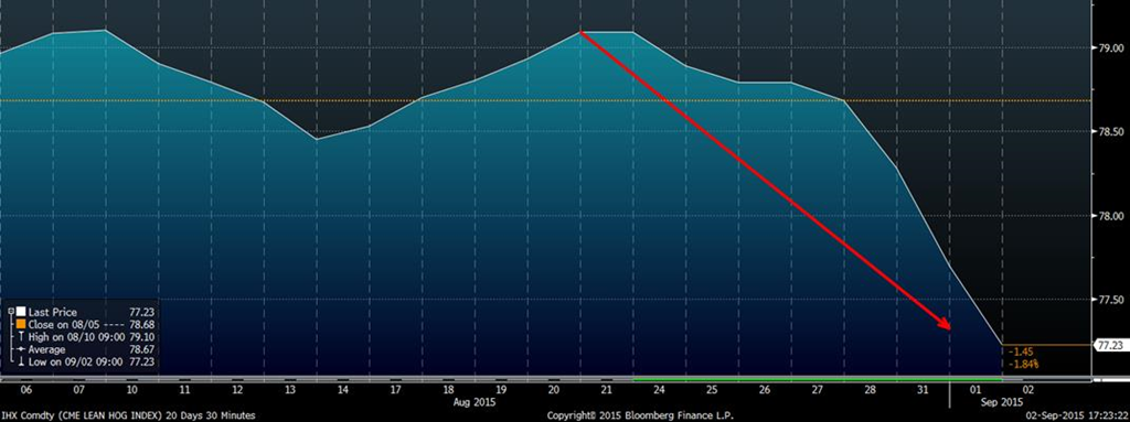 C’est une très belle journée pour les producteurs de porcs québécois! Le contrats à terme de leanhog augmente de 1.68 cents, le dollar chute pour atteindre une valeur en $CA/porc qu’on avait pas vu depuis le printemps dernier. En fait le contrat à terme sur octobre si on le remet en dollar canadien et ajuste le prix sur l’indice « Porcs Qualité Québec » on atteint une valeur de 188.60 $CA/porc, soit une hausse de 19.64% depuis le creux du mois de juin (graph 1). Dans le dernier hebdomadaire économique du CDPQ (Volume 16, numéro 21, 31 aout 2015) on pouvait voir que le revenu de vente cumulé au 100Kg était de 185.78$ tandis que le revenu stabilité ajusté de la financière agricole en date du 2 juillet 2015 était de 189.79 $/porc. L’importance de comprendre les différents mécanismes de stabilisation de prix est que si on dépasse cette valeur via les contrats en bourse, il devient intéressant d’utiliser les instruments financiers pour battre le modèle et assurer la sécurité financière de l’entreprise.