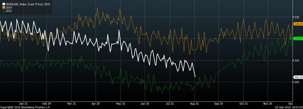 Le fondamental nous rappelle que c’est possible d’avoir un prix plus élevé, mais qu’il faut demeurer réaliste. Le prix cash semble avoir commencé sa chute saisonnière ; à 77.23 aujourd’hui l’indice sera publié a 76.88 (-0.35) demain. L’indice affiche un déclin stable de près de 0.30 cents à chaque jour depuis les 8 dernières séances (graph 3) qui concorde aussi avec la fin de l’approvisionnement pour le long weekend du Labor Day. La saisonnalité et le déclin des prix au comptant pourraient donc limiter la hausse des prix. La demande est au rendez-vous, on le voit avec les marges d’abattage qui sont à 8.71 cents la livre entre le cutout et l’index (graph 4). Si je regarde depuis 1998 les marges sont en moyenne positive de 3.50 cents ce qui fait qu’en théorie les abattoirs peuvent se permettre de payer la carcasse un peu plus cher sans devoir empiéter sur la rentabilité. Le poids des bêtes était en déclin et le marché attend de voir un rebond saisonnier de ce côté. Livré à 206.10 livres actuellement, le poids est plus faible que l’an passé, mais demeure plus élevé qu’en 2013 (graph 5). Le comportement du marché au retour de la fête du travail sera important et dictera la tendance des prix jusqu’au rapport Hogs and Pigs du 25 septembre prochain.