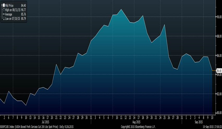 Le cutout qui se tenait au-dessus de 85.00 cents depuis le 1er septembre alors que le cash s’affaissait à chaque jour a finalement fléchi (graphe 3). Le prix de la découpe est de 84.40 cents, en baisse de 1.41 L’indice des prix cash (Lean Hog Index) sera publié demain à 73.08, en baisse de 0.84 cents.