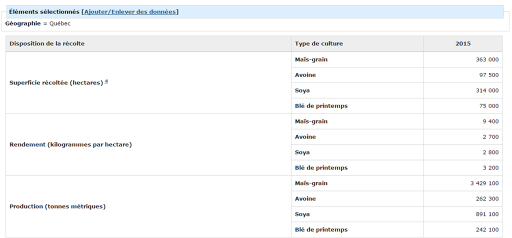 Selon l'approche de modélisation, la production estimative à l'échelle nationale (voir la note aux lecteurs) de blé et de canola en 2015 devrait être plus faible qu'en 2014, tandis que celles du soya, du maïs-grain, de l'orge et de l'avoine devraient augmenter comparativement à l'année précédente.