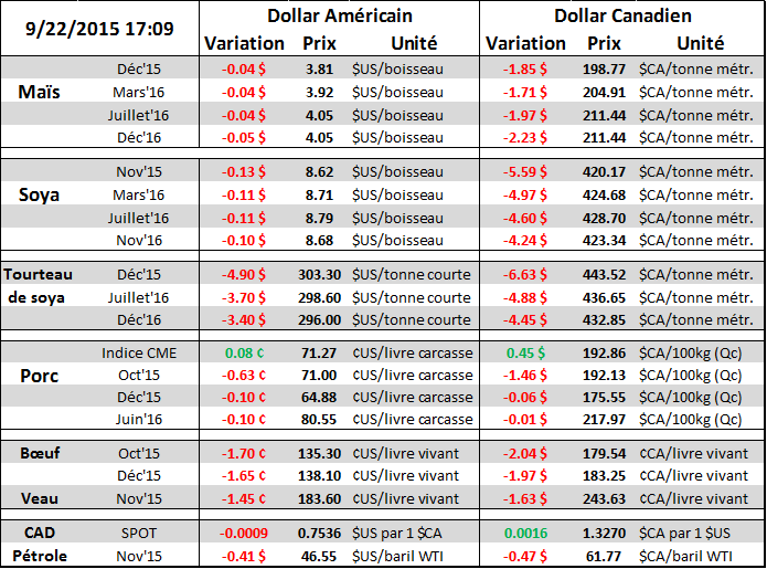 À 8.61 $US/boisseau, le prix de soya nouvelle récolte a terminé la journée à son plus faible niveau depuis le printemps 2009. Apparemment, l’arrivée du Président chinois aux États-Unis n’a pas supporté les prix, alors que plusieurs analystes prévoient des achats massives de la Chine pendant la visite du Président, de l’ordre de 3 millions tonnes. Reste à voir si des achats anormaux surviendront, ce serait l’une des seules façon de rattraper l’énorme retard dans les ventes pour 2015/16. De son côté, le tourteau de décembre a clôturé à 303 $US/tonne courte, le plus bas prix depuis 3 mois. Considérant l’abondance de fève et la marge de trituration élevée (près de 1$US/boisseau), la production de tourteau devrait continuer à osciller les records, mais qu’en est-il de la demande ? La surproduction de l’an dernier s’est bien vendue outremers, mais il se pourrait que ce surplus ne soit pas facilement vendable cette année. Plus du quart de la production de tourteau devrait être exportée, mais les ventes à l’exportation ne sont qu’à mi-chemin avec la proportion de l’an dernier… Bref tout cela pour dire que l’offre de tourteau sera élevée et que la demande extérieure pourrait s’avérer plus faible, donc négatif pour le prix sur une perspective de quelques mois.
