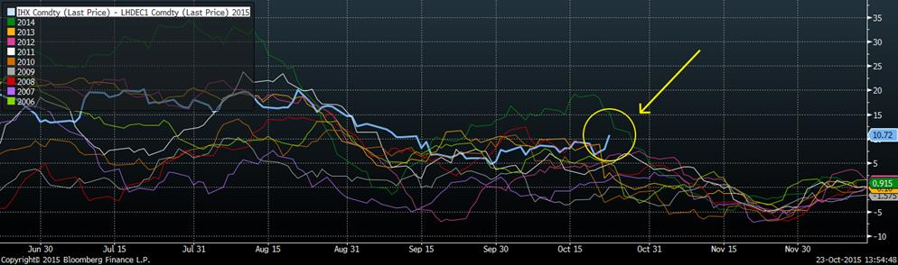 Seulement 48 heures après s’être transigé à son sommet de 4 mois 1/2 (graphique 1), le contrat à terme de porc sur décembre était en baisse de 3 ¢/lb durant l’après-midi pour finir la journée légèrement au-dessus de la limite baissière. Le mouvement a commencé avec une ouverture légèrement dans le rouge, mais une fois la tendance haussière et la moyenne mobile 200 jours brisées, les vendeurs sont venus envahir le marché. Il s’est transigé 33 600 contrats sur décembre ce qui est 50% de plus la journée précédente la plus active ce qui est normalement une confirmation du mouvement. On peut donc attribuer la majeure partie de la baisse d’aujourd’hui a des facteurs techniques ainsi qu’à la dépréciation de la devise européenne qui a perdu 3% en deux jours face au dollar américain, rendant la viande européenne moins chère aux yeux des acheteurs internationaux. Au niveau actuel, les écarts entre le prix du contrat de décembre et ceux du marché cash sont anormaux. D’une part, l’écart entre l’indice du prix cash et celui de décembre est de 10.7 ¢/lb (graphique 2) ce qui est contre la tendance saisonnière et le deuxième écart le plus élevé après 2014. D’autre part, l’écart entre la valeur de la carcasse découpée et celui du contrat de décembre est de 21.5 ¢/lb, un record surpassant même l’énorme écart de 2014 (graphique 3). En d’autres mots, le prix du contrat de décembre est maintenant très bas comparativement au marché cash, mais notez que cela n’est pas gage d’une augmentation du prix sur décembre, ça peut aussi être une contraction du marché cash qui pourrait causer un retour à la normale.