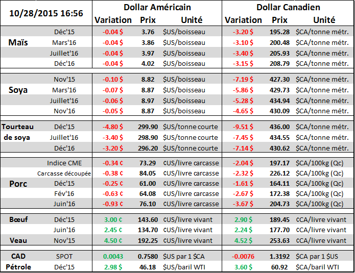 Les acheteurs chinois de drèche de maïs américaine ont arrêté les nouvelles commandes alors qu’on parle d’imposer une loi « anti-dumping» à Bejing. Le dumping (à différencier de dumpling qui est un ravioli chinois…) est un terme économique pour désigner une pratique commerciale en vendant à l’étranger un produit sous le prix local ou le coût de production afin de s’en départir sans trop perdre. Les chinois stipulent que la production excédentaire de drèche américaine cause une compétition déloyale contre la production d’éthanol locale. Cette nouvelle coïncide étrangement avec la récente annonce que la Chine redémarre la production d’éthanol à base de maïs afin de liquider les énormes inventaires « stratégiques » du pays. La Chine a importé 5.2M tonnes de drèche américaine en 2014/15, soit une baisse de 15% par rapport les 6.1M tonnes en 2013/14. C’était tout de même l’équivalent de 46% des exportations de drèche et le second plus gros acheteur était le Canada avec un gros 1.6M tonnes. Par ailleurs, il y aurait apparemment une livraison de maïs de 54,000 tonnes qui serait en chemin vers les États-Unis, en provenance du Brésil. Sans trop de détail, cette livraison provoque des questionnements sur la raison de l’achat puisque les américains sont le plus important exportateur de maïs. Cela cause des doutes sur le prix américain qui pourrait être trop cher et pas compétitif face à l’Amérique du Sud. De plus, la compétition pourrait s’accentuer si le candidat Macri aux élections fédérales de l’Argentine puisqu’il promet d’éliminer les taxes à l’exportation sur le maïs et le blé dès le premier jour de son mandat, ce qui augmenterait la compétitivité des grains d’Argentine.