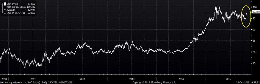 Le dollar canadien a grandement bougé aujourd’hui, avec des bas à 75.27 et des haut à 76.37, pour finir la journée à mi-chemin. D’une part, le prix du pétrole a rebondi de 3$/baril suite à des chiffres d’inventaire très légèrement sous les attentes, ce qui avait causé l’envol de notre huard. Par la suite, la réserve fédérale américaine a fait une conférence de presse plutôt optimiste face à leur économie ce qui causé le recul à mi-chemin du dollar canadien. Un facteur négatif pour l’ensemble des prix des matières premières est la force du dollar américain qui atteint un sommet depuis 2 mois face à un panier de devise. L’indice du dollar US frôle le 98.00 (graphique 4) particulièrement grâce au recul de l’EURO.