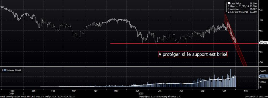 Selon Steve Meyer, le prix actuel du porc de décembre implique une valeur sous le 50¢/lb pour le jambon et sous 1.00$/lb pour le bacon ce qui est bien en-dessous du fondamentale. En effet, la production est à son plus faible niveau relativement aux années précédentes, mais la demande reste primordiale pour que le prix demeure bon, ce qui est actuellement incertain. Bien que l’annonce de l’OMS peut sembler « banal » pour certaines personnes, il ne faut pas sous-estimer la capacité de la demande à reculer. De plus, cette nouvelle survient durant la période de l’année où la production est à son plus haut niveau, il y aura donc une abondance de viande pendant que la consommation reculera. Dans la viande, la production est ferme et ne peut pas être déplacée d’un mois à l’autre ce qui s’appelle une « offre inélastique » en économie. Autrement dit, tout ce qui est produit doit être consommé. Donc, si la demande recul, le prix devra faire en sorte qu’on retrouve un équilibre entre la production et la consommation… le problème est qu’on ne peut pas calculer quelle sera l’impact réel sur la demande et sa durée. Il faut donc rester prudent : si les prix brisent leur support (graphique 2), il faut protéger une partie de la production pour limiter les pertes au niveau de la production de décembre et un peu février. La tempête peut durer seulement 1 mois comme elle pourrait en durer 3, personne le sait. Le danger est que les consommateurs réagissent comme lorsqu’il y a une maladie, la dernière fois c’était la H1N1 et le prix cash avait chuté de 20% en 3 semaines à 48¢/lb… c’est le scénario qu’on veut éviter si le support est brisé.