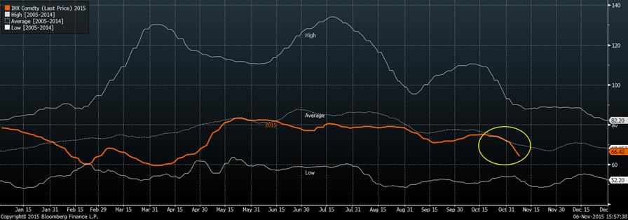 En outre, le prix des viandes rouges ont connu une sévère correction cette semaine avec une baisse de 4¢/lb pour le porc et 5¢/lb pour le bœuf. Le prix du porc sur décembre a brisé hier son support à 57.00 (graphique 3) pour finir la semaine à 55 ¢/lb. La pression du marché cash continue à se faire ressentir avec une baisse de 10% cette semaine (-6.5 ¢/lb) et de 3¢/lb de la carcasse découpé. Définitivement, le gros perdant c’est le prix du bacon qui s’est replié de 30% depuis 2 semaines. Il est normale que le prix du porc baisse durant le mois de novembre, mais la baisse est beaucoup plus prononcée depuis le rapport de l’OMS (graphique 4). Les chiffres de production deviennent secondaire, c’est maintenant la demande qui dictera le marché du porc. Notez qu’on est sous les niveaux de l’ASRA au Québec pour le reste de 2015 et même qu’il n’y a aucune profitabilité pour l’ensemble de 2016, la situation ne peut donc pas se détériorer d’avantage pour la production de porc assurée. Il reste à voir si les faibles prix stimuleront la demande (locale ou internationale) pour 2016.