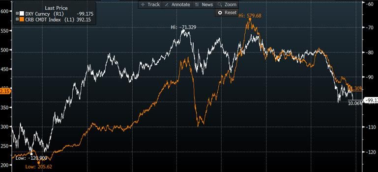 Graphique 2 – Indice CRB (orange) et indice du dollar US inversé (blanc)
