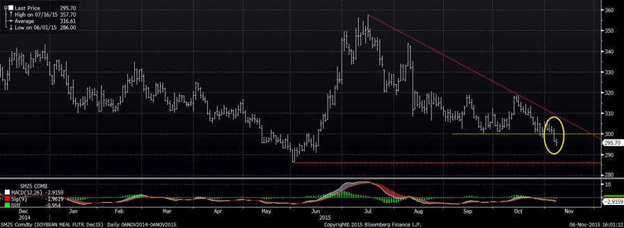 Graphique 5 – Prix du tourteau de soya sur décembre 2015 ($US/tonne courte)