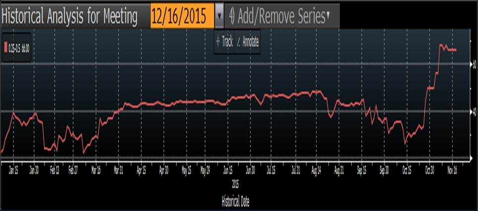 Graphe 4 – Probabilité d’une hausse des taux en décembre (USA). 18 Novembre = 66% Source Bloomberg.