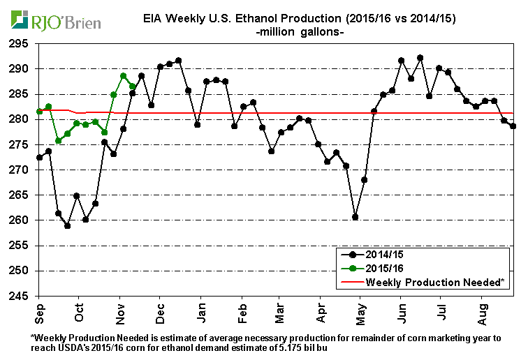 Graphe 1 – Production hebdo d’éthanol nécessaire pour atteindre cible USDA sur utilisation du corn.