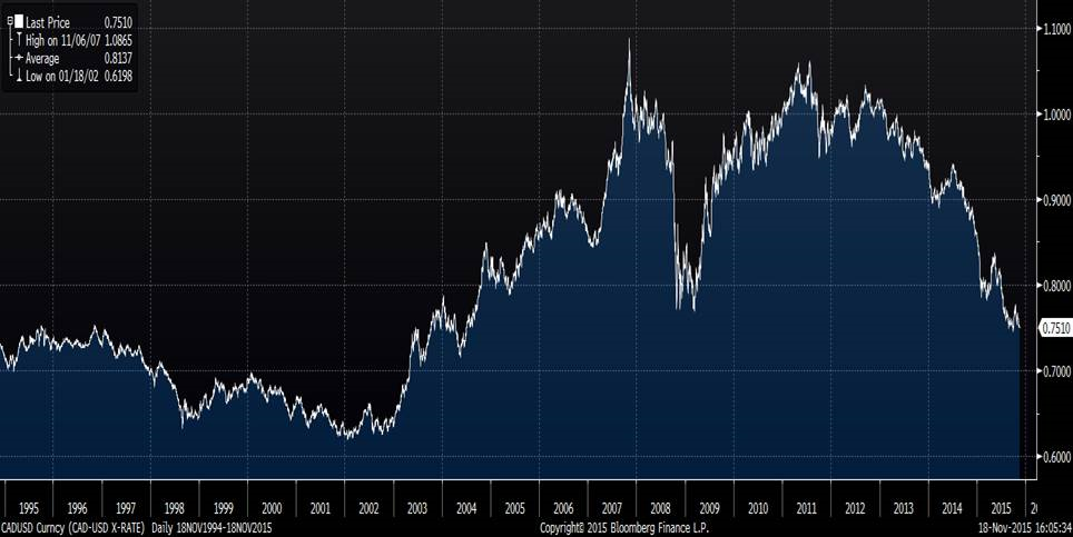 Graphe 5 – Variation du dollar canadien versus USD depuis 20 ans. Source Bloomberg.