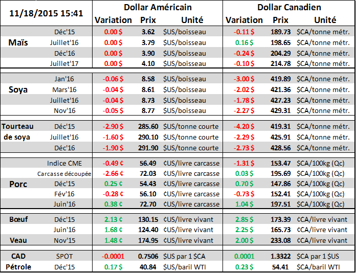 Cet après-midi à 14 heures la Réserve Fédérale américaine (la Fed!) nous donnais le procès-verbal de leur rencontre du mois passé. Sommes toute l’information contenue n’a pas surpris les traders ; le dollar américain est demeuré stable et fort, ce qui supporte l’idée d’une hausse des taux en décembre. D’ailleurs selon le marché à terme des taux d’intérêt américains, la probabilité d’une hausse de taux en décembre est à 66% (voir graphe 4). Et c’est ce que les membres du comité disent depuis des semaines en répétant qu’ils s’en remettent au statistiques économiques d’ici le 16 décembre avant de prendre une décision. On continue évidemment de suivre le tout puisque l’impact est immédiat sur le dollar canadien. Une hausse des taux aux États-Unis est un élément qui laisse le huard faible (voir graphe 5). Avec le prix des denrées agricoles à des bas de plusieurs mois, sinon années, les producteurs canadiens « espèrent » évidemment retrouver un prix plus alléchant via un dollar faible.