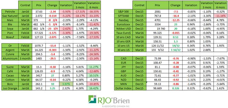 L’indice Canadien a eu la plus mauvaise performance de tous les indices majeurs en baisse de plus de 10% cette année. Les secteurs des métaux et de l’énergie ayant fortement impacte l’indice ainsi que les débâcles de Valeant et de Bombardier. Ces baisses sont encore plus élevées pour des investisseurs Américains puisque le CAD a parallèlement recule de 14%.
