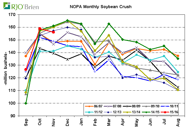 Trituration de soja pour novembre et annuel (saisonnier) – Source National Oilseed Processors Association (NOPA)et RJO’Brien