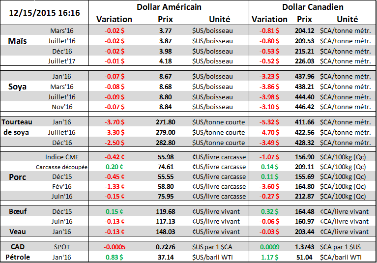 Trituration de soja (Nopa Crush) : Les chiffres d’utilisation de fève pour la transformation en huile et tourteau ont été plus faible que les prévisions des analystes. À 156.1 millions de boisseaux, c’est beaucoup plus faible que la moyenne des prévisions à 161.7 et même carrément à l’extérieur de la fourchette (157.7 à 165.4). La transformation en novembre 2015 sera la plus faible en 4 ans malgré l’abondance de fève. La récolte de soja s’est déroulée sans trop de misère et nous pensons que le volume record de septembre et octobre contribuent fortement à la transformation plus faible en novembre. Sommes toute le trimestre aura vu près de 472 millions de boisseaux, contrairement à 440 l’an dernier et il faudra donc transformer 1.418 milliard de boisseaux pour le reste de l’année de commercialisation 2015/16 afin d’atteindre la cible USDA de 1.890 milliard lors du dernier rapport WASDE.
