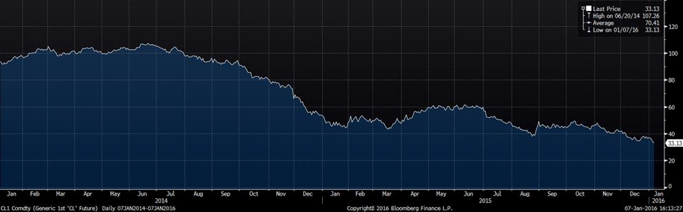 On a l’impression de se répéter: le baril de pétrole a fait un nouveau bas aujourd’hui, terminant la journée à près de 33.00 $US/baril (graphique 1), ce qui a entrainé notre dollar canadien vers le bas… et oui, ça continue! La Chine augmente l’incertitude des marchés financiers avec un autre crash de -7% à la Bourse de Shanghai ainsi qu’une d’évaluation du yuan, ce qui cause du tort aux prix des matières premières industrielles, telles les métaux et l’énergie. Avec la volatilité des marchés financiers qui a augmenté en 2016, quelques grands investisseurs commencent à parler d’un « cocktail dangereux » et ce n’est pas un environnement positif pour la demande de matières premières en générale.
