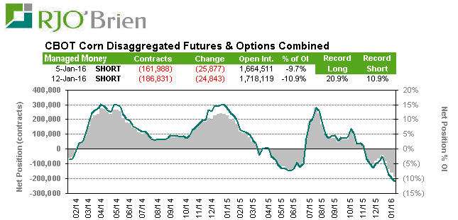 Corn : Les fonds sont net short 186,831 contrats ou options, c’est un record compte tenu de l’open interest. La donnée date du 12 janvier, les fonds liquident depuis déjà plusieurs jours.