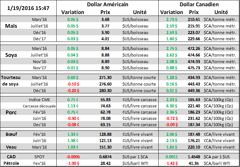 Nous allons savoir demain matin à 10AM si la Banque du Canada baissera son taux directeur. Les probabilités implicites d’une baisse de taux (calculées à partir des contrats à terme de la bourse de Montréal) est de 50% actuellement. Ça parait compliqué comme affirmation, mais en réalité ce qu’il faut retenir c’est que les marchés ne savent pas ce qu’il va arriver demain. C’est pile ou face ; une personne sur deux mise sur une baisse, l’autre sur une hausse…. L’important ici c’est de comprendre l’effet qu’une baisse de taux au Canada aura un effet négatif sur la valeur du huard face au USD. Actuellement le taux directeur est de 0.5% et le dollar canadien est à 68.74 $USD. Nécessairement le dollar est actuellement la clé du succès pour le producteurs canadien ; les contrats de mais nouvelle récolte valent 223$ la tonne via contrats CBOT et taux de change actuel.