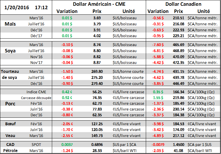 Dollar Canadien : Après plusieurs jours d’incertitude et de spéculation à savoir si la Banque du Canada allait couper les taux aujourd’hui, nous avons enfin la réponse. NON, notre banque centrale ne bouge pas et maintien le taux directeur à 0.50%. L’effet immédiat a été positif pour le dollar canadien, mais la baisse du pétrole a continué de plomber le huard pendant la session. Les perspective de la Banque du Canada pour le pétrole ne sont pas favorable et pourraient maintenir le dollar faible face au USD puisque les stocks mondiaux montre que l’offre est plus grande que la demande et pousse les prix à la baisse. Il faudra surveiller la croissance économique aux USA pour augmenter les exportations canadiennes et reprendre la croissance économique chez nous pour la deuxième moitié de 2016. La faiblesse du dollar est une très bonne nouvelle pour le secteur agricole et va soutenir la rentabilité des fermes cette année. Par contre, ce n’est pas la meilleure année pour renouveler l’équipement et machinerie puisque ça coutera beaucoup plus cher. Est-ce que cela pourra handicaper la productivité et la quête de rendement?
