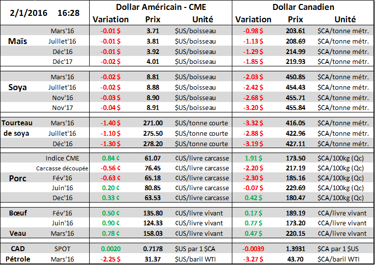 Entre le 19 et 26 janvier, les spéculateurs ont finalement racheté une grosse portion de leur position vendeur sur le marché du maïs. Plus précisément, ils ont acheté au net 71,000 contrats de maïs ce qui fait passer leur position de -158,000 à -87,000 contrats, alors que c’est principalement les producteurs qui ont pris la contrepartie en vendant leur récolte. Ce rachat était attendu suite au rapport de l’USDA du 12 janvier. Par contre, le fait que le prix a très peu bougé durant cette période n’augure pas trop bien. Clairement, les producteurs ont beaucoup d’inventaires à vendre prochainement et ils seront présents ce qui devrait limiter l’appréciation du prix du blé d’Inde. Incapable de franchir le cap du 3.72 $US/boisseau sur mars, le momentum haussier s’évapore graduellement et on perd la petite tendance haussière en place depuis la mi-janvier. Par ailleurs, les spéculateurs ont aussi acheté du blé, du tourteau et de l’huile de soya. En somme, en regroupant les 13 matières premières agricoles à la Bourse, les spéculateurs sont rendus net acheteur, une première pour 2016.