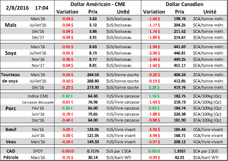La semaine dernière, CONAB (service des statistique du minitère de l’Agriculture au Brésil) a mis à jour ses prévisions. La production de soya pour l’année 2015/16 a été revue à la baisse de 1.2% en raison de rendement plus faible, mais la récolte sera tout de même 5% de plus que l’an dernier, à un niveau record. Le rendement brésilien est chiffré à 3 tonnes/hectare, soit l’équivalent de 45.2 boisseaux/acre. L’agence brésilienne établit désormais la production de fève à 100.9 millions de tonnes métriques, en baisse des estimés de janvier à 102.1 MTM, mais largement au-dessus des 96.2 MTM produites l’an dernier. Inversement, la production de maïs a été réévaluée à la hausse de 1.2% en raison d’un rendement plus élevé pour la 1er récolte de l’année ainsi que plus d’acréage. La production brésilienne de blé d’Inde devrait donc atteindre 83.2 millions de tonnes métriques, ce qui est 1 MTM de plus qu’en janvier et 1.7 MTM au-dessus des prévisions de l’USDA. Il sera donc intéressant de voir l’ajustement apporté par l’agence américaine dans son rapport de demain. Les prévisions d’ensemencement pour la 2ème récolte brésilienne (safrinha) ont été réévaluées à la hausse de 0.7%, mais demeurent inférieures aux semis de l’an dernier par l’ordre de 2.2%. Notez que la semaine dernière, le prix du maïs a fait un sommet historique à la Bourse brésilienne (graphique 1) à plus de 40 BRL/60kg soit l’équivalent de 4.30 $US/boisseau. Évidemment cela représente une incitation à produire d’avantage pour les producteurs.